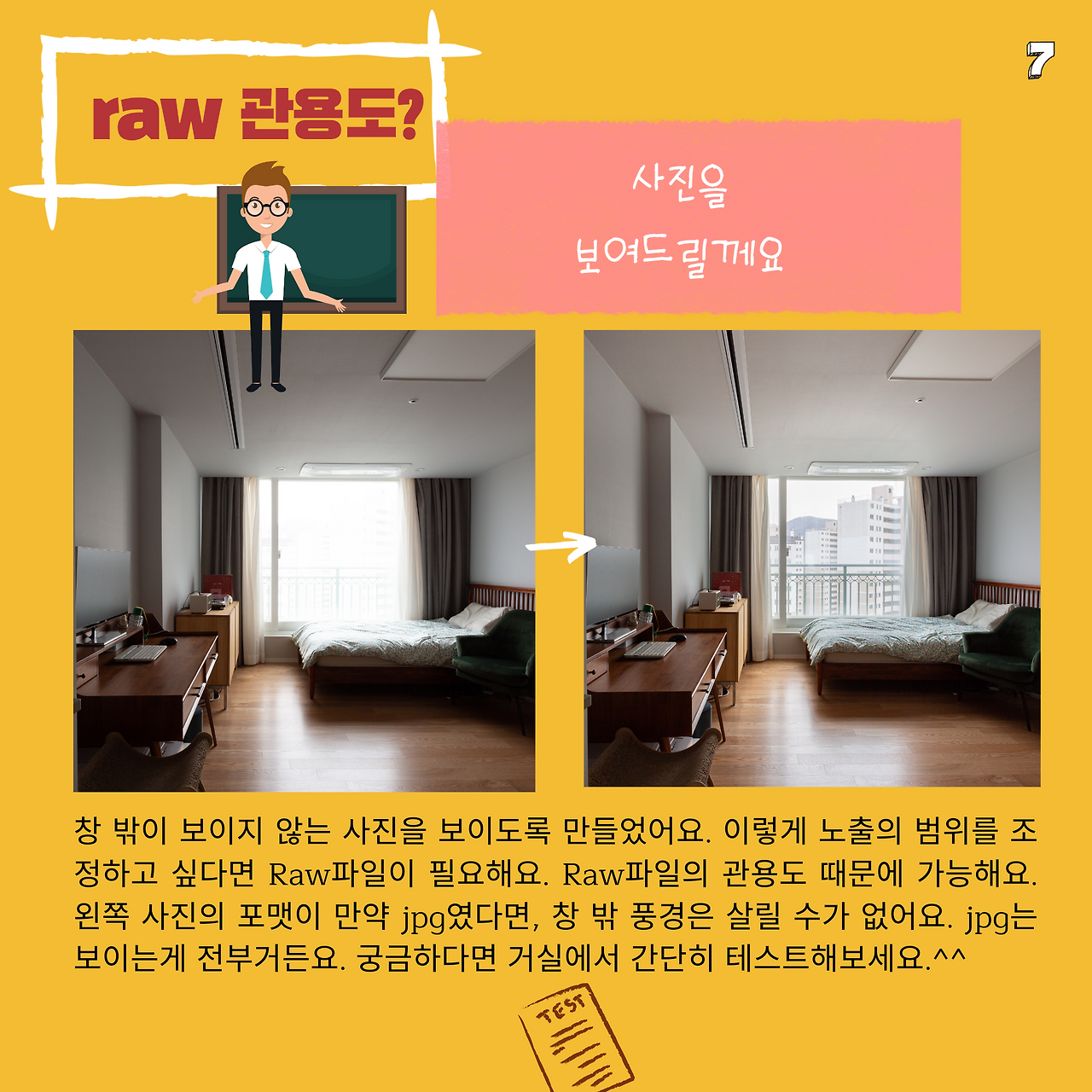그럼, 디지털 이미지를 생각해 보겠습니다. 사진관에서 원본파일이라고 받아둔 JPG 이미지가 있어요. 근데 창밖의 풍경은 보이지 않아서 아쉽고, 전체적인 색감도 인위적이라 최대한 자연스러운 톤으로 보정하고 싶다고 가정해 보겠습니다. 역시 사진관 사장님께 JPG파일을 전달하면서 이런 부분을 수정해 줄 것을 요청해요. 그럼 사진관 사장님께서는 어떤 반응을 보일까요? "혹시, RAW파일 가지고 계신가요?"라고 되물어볼 수 있어요. 색감을 조정하는 건 덧칠을 해서라도 어떻게든 맞추어볼 수 있다고 해도, 보이지 않는 창밖의 풍경은 RAW데이터가 없다면 살려낼 방법이 없으니까요. RAW데이터는 눈에 보이지 않는 영역의 데이터를 가지고 있어요. 이걸 RAW데이터의 관용도라고 하고요. 이젠 AI의 도움을 받으면 창밖의 풍경을 가상으로 만들어 넣을 순 있지만, 그때 그 분위기를 그대로 재현하려면 RAW데이터가 필요한 건 어쩔 수 없네요.