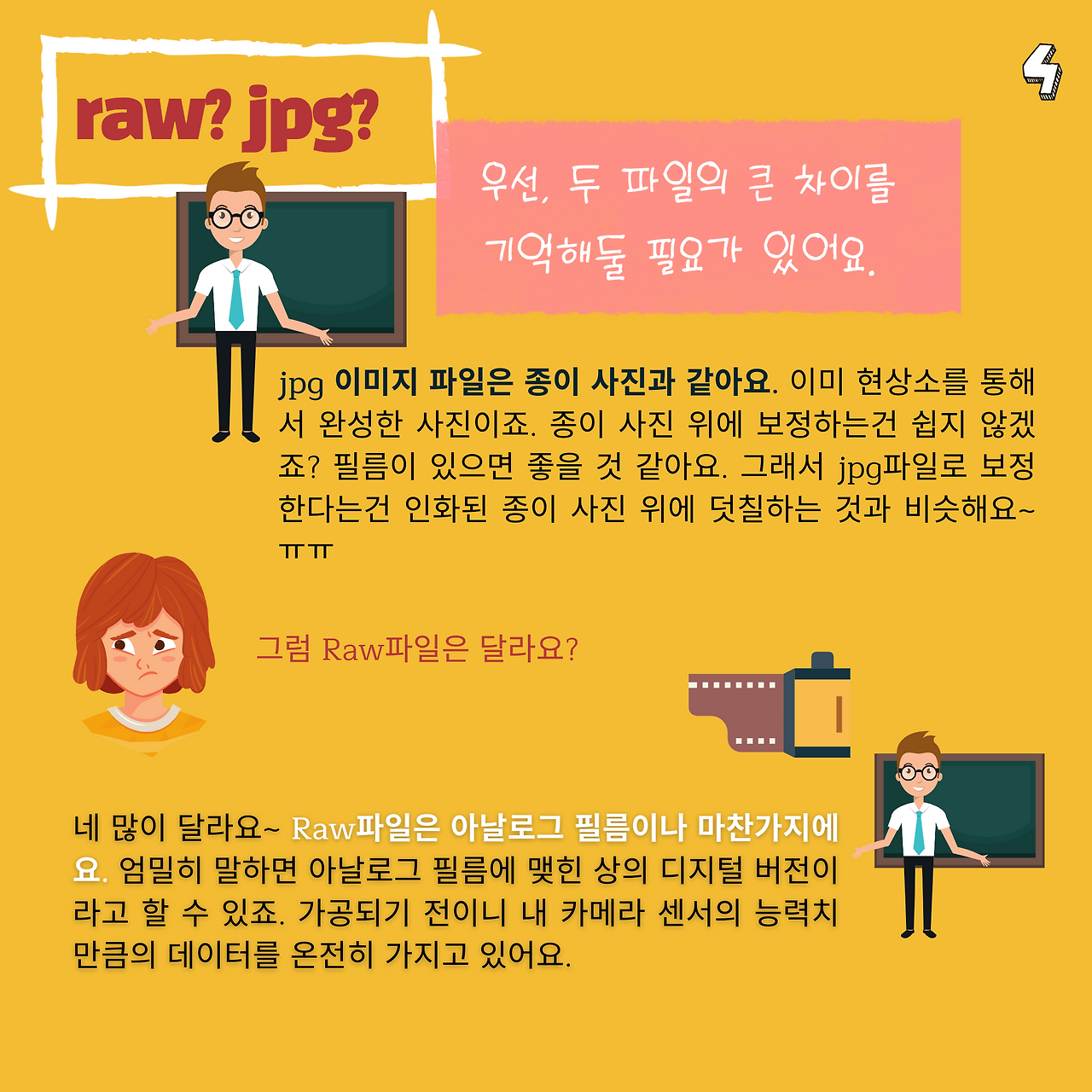 집에 있는 앨범 속 옛날 사진을 생각해 보겠습니다. 오래되어 색도 바래고, 잡티보정도 하고 싶고, 좀 더 큰 사이즈로 출력을 하고 싶어서 사진을 꺼내서 사진관에 가지고 갔다고 상상해 보세요. 종이사진을 사진관 사장님께 보여주면서 색감도 살려주시고, 잡티보정과 확대인화를 요청한다면, 사진관 사장님은 어떤 반응을 보일까요? 이렇게 다시 물어볼 확률이 높아요. "혹시 종이사진 말고 필름 가지고 계신가요?" 필름이 있다면 다시 암실에 들어가서 요청사항을 반영하는데 훨씬 수월할 테니까 말이죠.