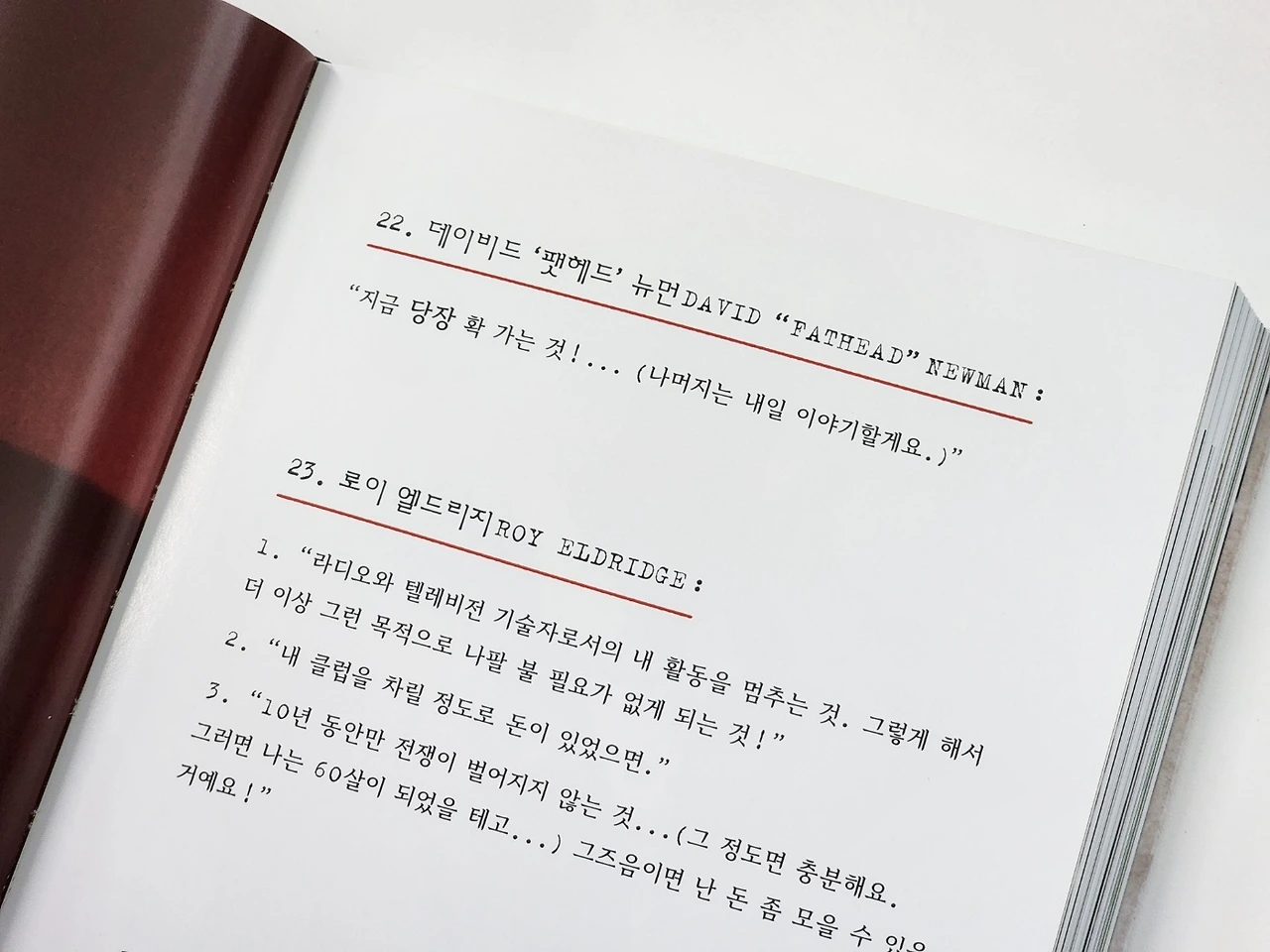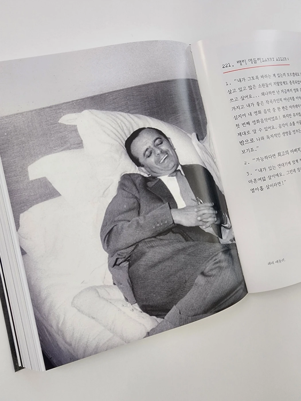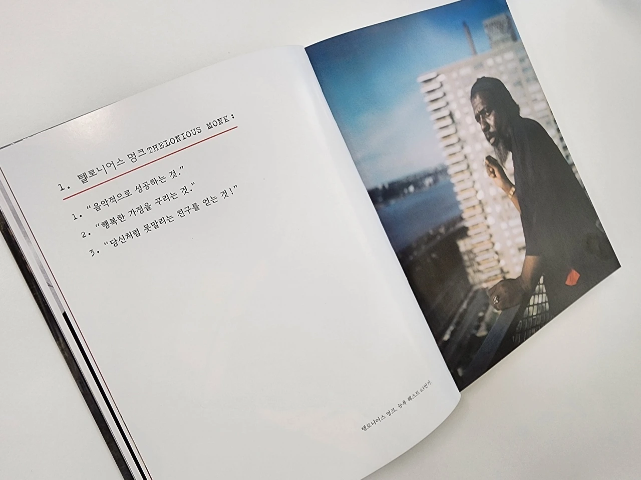 이렇게 사진을 끝까지 다 살펴본 후, 재즈거장 300명의 세 가지 소원을 읽기 시작했습니다. 책표지 주인공인 텔로니어스 멍크가 300명 중 첫 번째로 소원을 말해요. 글은 오히려 사진보다 더 빨리 읽고 있어요. 내 맘에 드는 소원 3가지를 찾으면서 빠르게 읽어나갔죠.