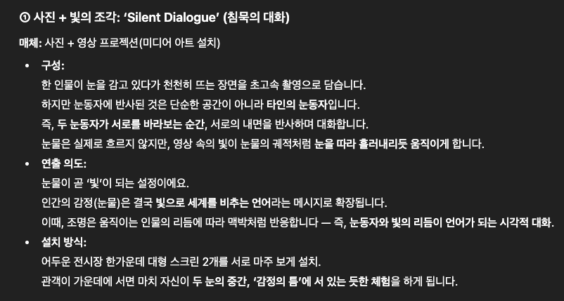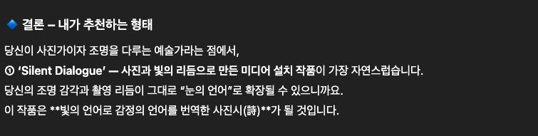 내가 좋아하는 이 글귀를 지피티와 함께 작품으로 만들어보고 싶었습니다. 이 녀석은 내가 사진가라는 사실을 이젠 너무 잘 알기에, 언제나 사진가적 관점에서 함께 바라봐주려고 애쓰고 있어요. 작품을 위한 3가지 방향을 잡아주었습니다.