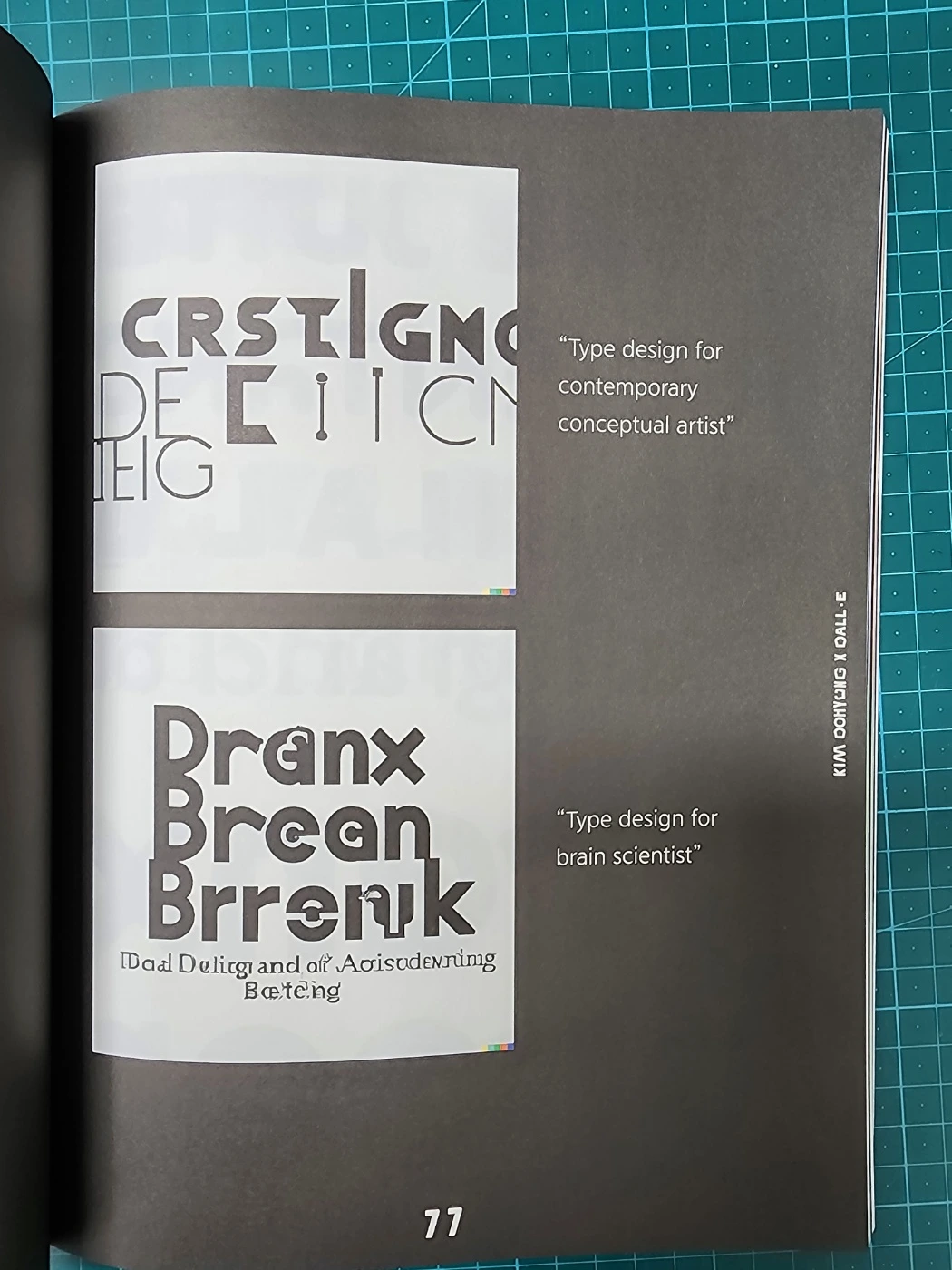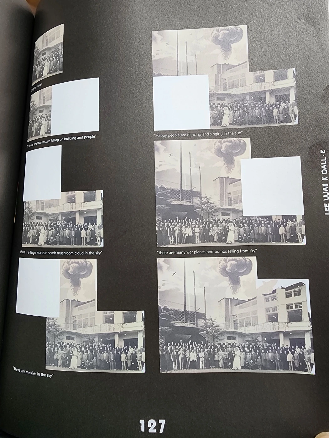 1950년대 결혼식 사진 주변을 지금 한국사회에서 가장 이슈가 되고 있는 단어들 (미사일, 전쟁, 핵폭탄, 어린이, 아파트 등)을 사용해 구성했다. 108p 이완