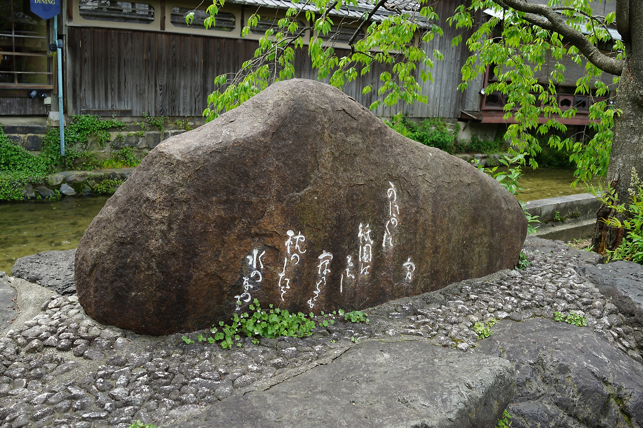 색감이 다양하지 않던 에도시대 느낌의 거리에 모여든 사람들은 색깔 하나씩을 더하고 있었다. 한쪽에선 이제 막 결혼을 위해 웨딩촬영을 하는 예비부부들이 생동하는 색상을 선사하고, 그 곁을 조심스레 그리고 신속하게 지나는 관광객들이 어우러지며 거리엔 활력이 느껴졌다. 그 곁을 살며시 지나는 우아하고 화려한 모습의 마이코가 스치듯 강렬한 색 하나를 더한다. 무채색 배경에 흩뿌려진 듯한 색감들이 서로 조화를 이루며 한 폭의 그림은 이런 식으로 만들어지는 거구나 생각하고 걷는데 시구인 듯한 글 귀가 적힌 바위 하나가 눈에 들어왔다.
