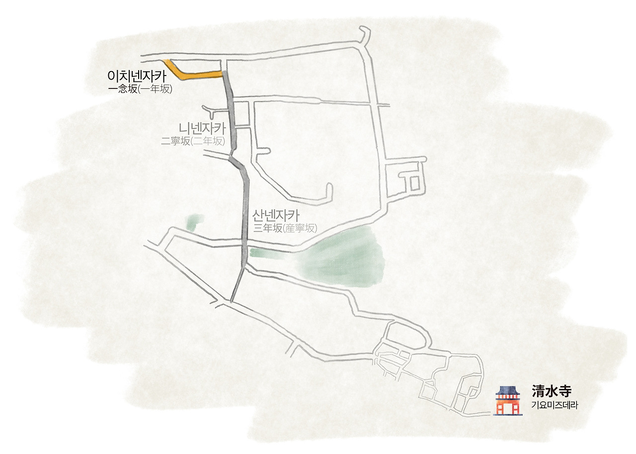 이름에 비해 단조로운 길에서 실망감과 아쉬움이 뒤섞여 왜 이런 이름을 갖게 됐는지 호기심이 생겼다. 물론 기록에 남아있는 편린 중에는 기요미즈데라(清水寺)로 가는 유명한 언덕 니넨자카(二寧坂)와 이어지는 첫 번째 길이기 때문이라는 설도 있지만 다른 의미도 있지 않을까 궁금했다.
