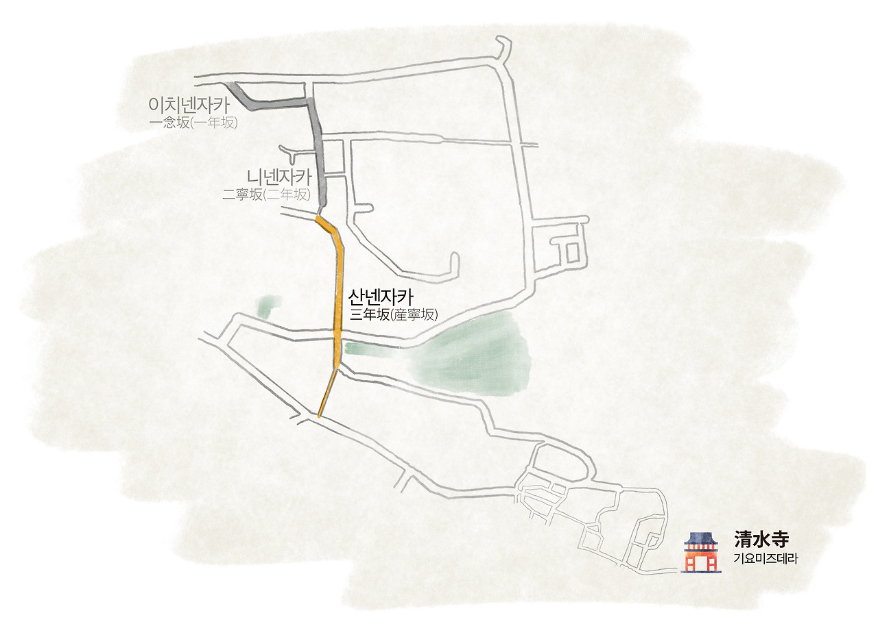 니넨자카의 다케히사 유메지와 히노코가 해로(偕老)했다면 새로운 탄생의 염원을 품고 걸었을 언덕이 산넨자카(産寧坂)이다. 다른 두 언덕에 비해 경사가 있는 산넨자카는 기요미즈데라로 향하는 가장 유명한 언덕이다. 경사가 급해 오르기 힘든 길임에도 산모들이 많이 찾았다. 출산의 평안함(産寧)을 기원하기 위해 걸었던 길이기 때문이다. 산넨자카가 지금의 명성을 갖게 되기까지 예로부터 전해진 이야기들이 있다. 아마테라스(태양신)에게 받은 자안관음상으로 황자와 황녀를 순산한 황비가 현재의 기요미즈데라 근처에 절을 짓고 탑에 자안관음상을 안치했기 때문이라는 이야기가 있고, 유명한 장군의 아내가 아이를 잉태하기 위해 올랐던 길이라는 이야기도 있다. 사실 어느 것 하나 명확하게 기록된 사실은 없다. 그저 입에서 입으로 전해져 길에 스며든 거다.