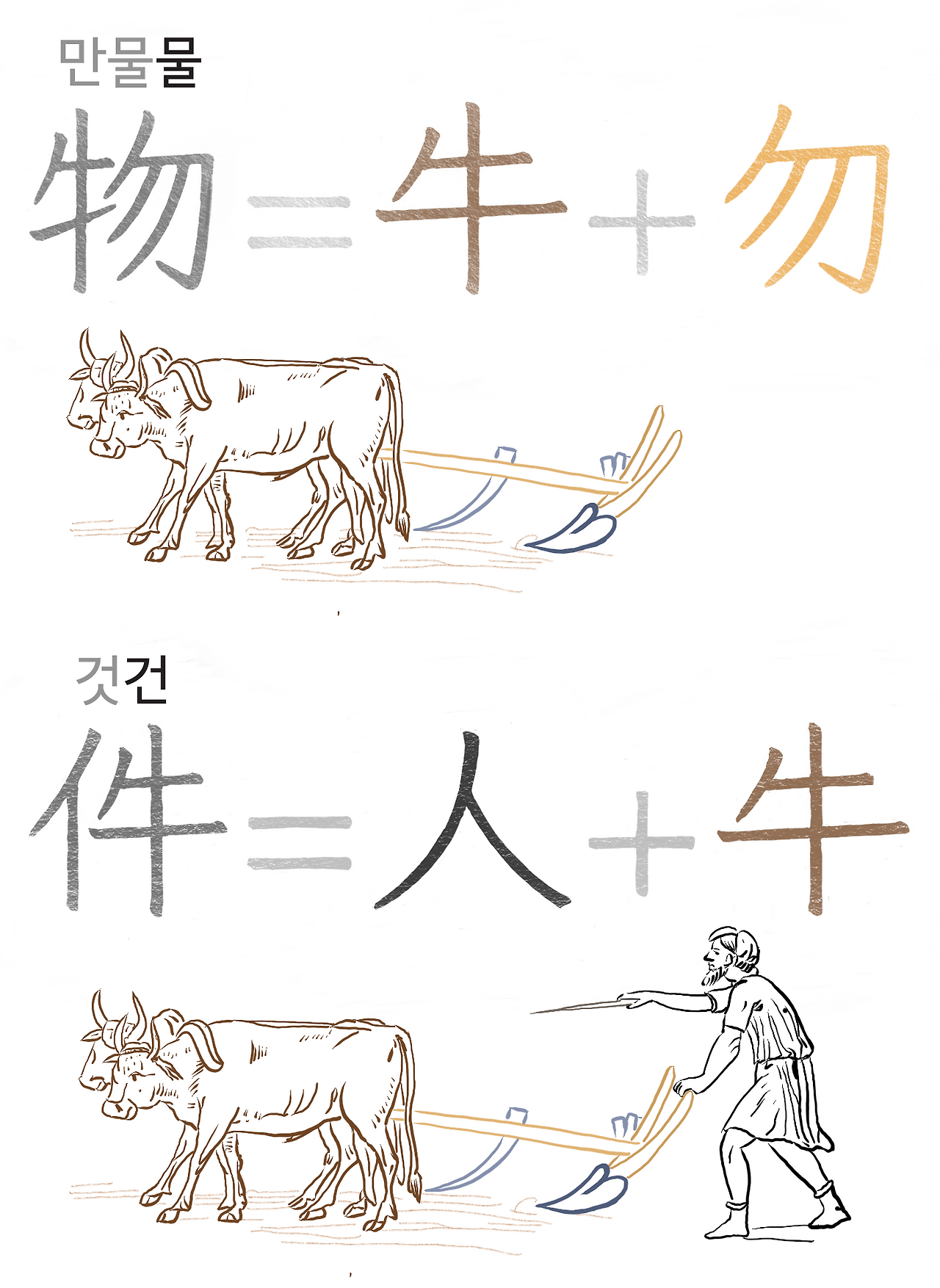 ‘물物’ 은 ‘소牛’가 ‘쟁기勿’를 끌고 가는 형상이다. 소가 땅을 갈고 거기서 수확되는 것들을 의미하는 것 같다. 농경사회에서 생긴 단어의 의미로는 적절해 보인다. ‘건件’은 ‘사람人’이 ’ 소牛’ 앞에서 끌고 가는 형상이다. 이 두 글자가 모여서 ‘물건’이 된다. ‘물’ 자 하나로도 충분한 의미가 되는 데 왜 ‘건’ 자가 합쳐져야 완성된 단어가 될까 하는 궁금증이 생겼다.