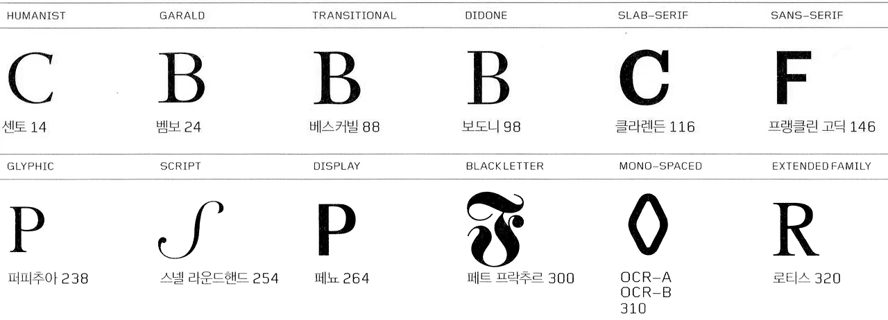 활자는 초기에 수도사의 필사체를 닮으려고 노력했고(Humanist) 수학이 발달하면서 수학적 계산으로 정교해졌으며(DIDONE) 산업혁명의 기운으로 강렬하고 두꺼운 모습이 되기도(Slab-Serif) 하였죠.