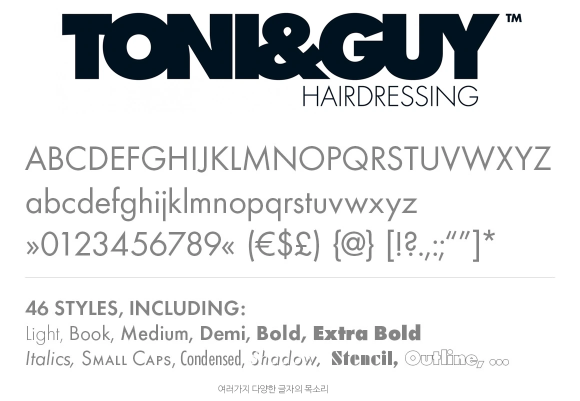 영국의 토니 앤 가이 Tony & Guy는 1963년 런던 남부의 “Clapham” 에 살롱 개점을 시작으로 전 세계 41개국에 402개의 헤어 살롱을 두고 있습니다. 패션과 헤어스타일을 접목시켜 새로운 헤어 트렌드를 제시하는 ‘HAIRDRESSING’이란 콘셉트를 가지고 있죠. 'HAIRDRESSING'은 말 그대로 헤어도 패션의 일부라는 의미로 쉽게 이해됩니다. 토니 앤 가이의 로고는 푸투라 Futura 의 패밀리 글꼴을 사용하고 있습니다. 메인로고는 푸투라 Extra Bold, 아래의 태그는 푸투라 Light입니다. 토니 앤 가이 로고는 쉬운 이야기를 한 사람이 여러 가지 억양으로 이야기하고 있는 거죠.