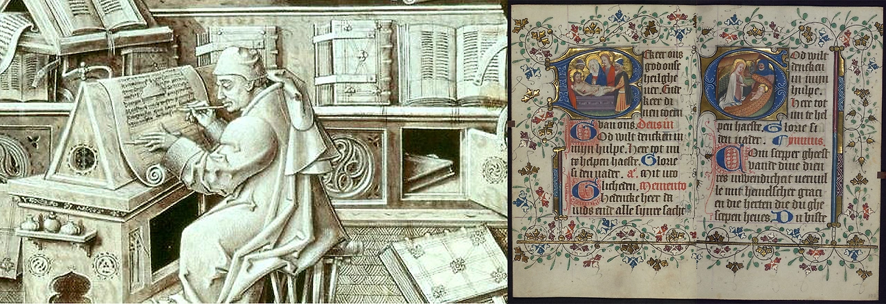 1세기에 중국에서 만들어진 종이는 실크로드를 거쳐 12세기에 유럽에 전해집니다. 12세기 중세 유럽은 종교와 귀족 중심의 신권사회로 종교 문서와 공문서를 필두로 가치 있는 글들을 양피지에 필사(스크립토리움)하는 시기였습니다. 이 시기의 필사는 신의 말씀을 기록하는 성스러운 일이었기에 마음과 영혼, 의지를 다해서 기록하였고 그 수준은 가히 예술작품의 경지였죠.