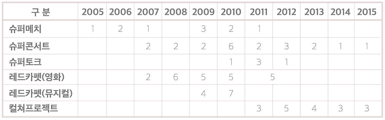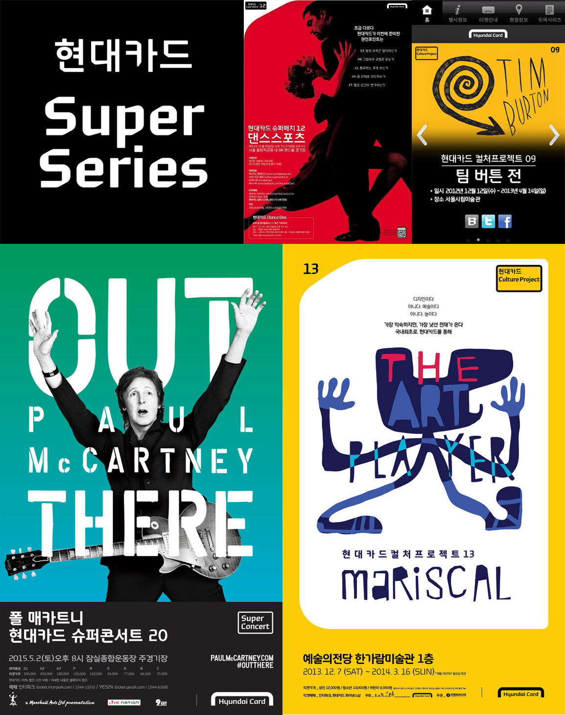그 후 현대카드는 타 카드와 다른 움직임을 보입니다. 슈퍼~라는 이름을 가진 경기, 공연, 토론회를 개최하고 세계적으로 유명한 사람들을 불러오기 시작합니다. ‘내’가 정말로 좋아하지만 한국엔 오지 않을 것 같은 유명인들이 한국에서 경기(슈퍼메치), 콘서트(슈퍼콘서트)를 열고 세계적인 석학들이 한국에 모여 토론(슈퍼토크)의 장을 펼칩니다. 세계 3대 오페라 <뉴욕 메트로폴리탄 오페라>를(레드카펫) 국내 최초로 열기도 하죠. ‘컬처프로젝트’를 통해 예술가뿐 만이 아니라 괄목할 만한 건축가와 영화감독, 영화까지 전시를 하기도 합니다.