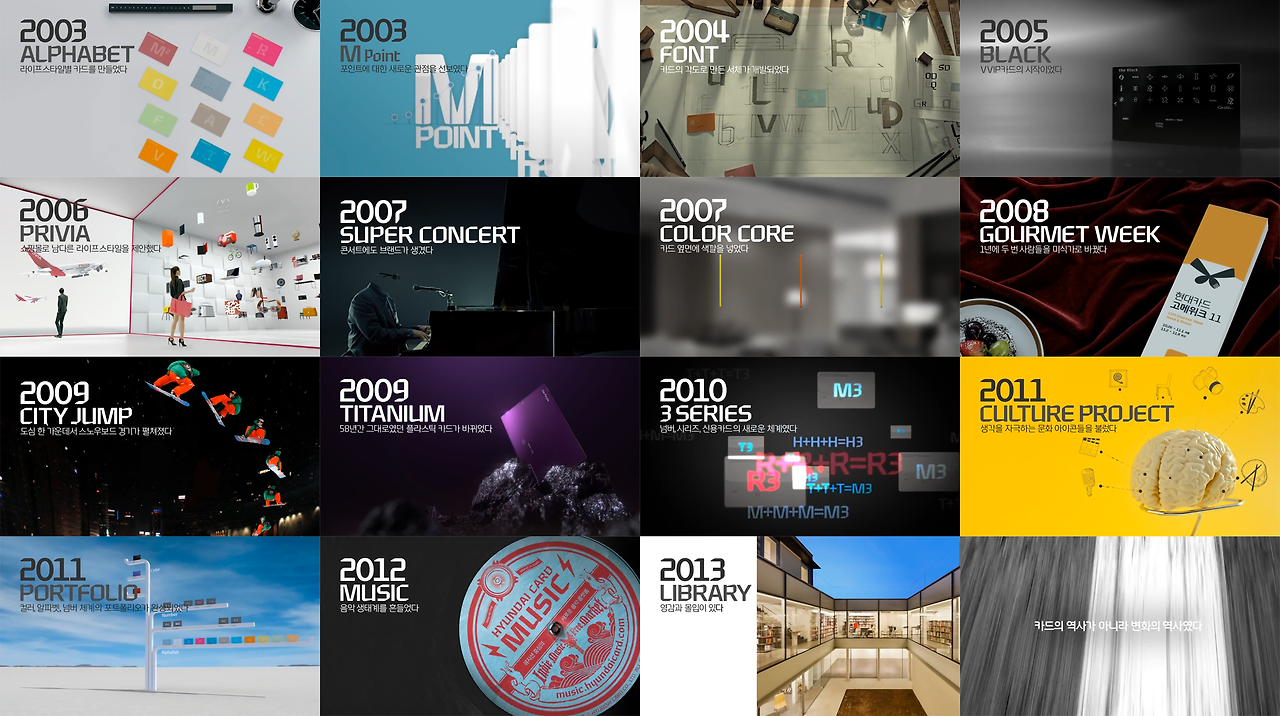 각종 신용카드가 난무하던 2001년 현대카드는 조금은 뒤늦게 창립을 했습니다. 그리고 2003년 특별한 카드를 출시합니다. 카드 전면에 커다란 알파벳 글자가 쓰인 카드의 각 알파벳은 라이프 스타일을 표현한 것이었죠.