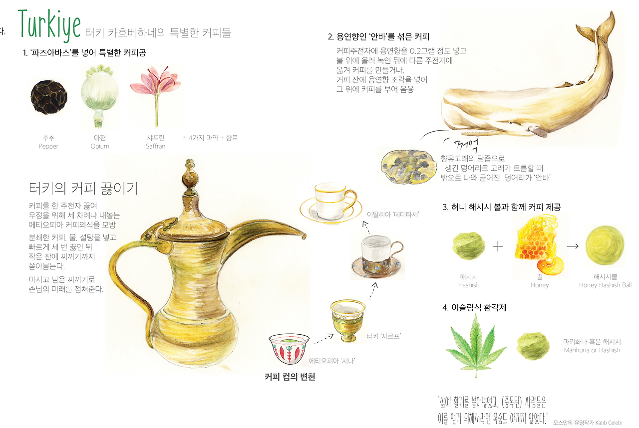 오스만투르크의 시대 16세기, 아프리카에서 홍해를 건너온 커피는 쇄국적인 정책에도 불구하고 100년도 안되서 전 세계를 향해 그 아로마를 퍼트리게 되었다.
