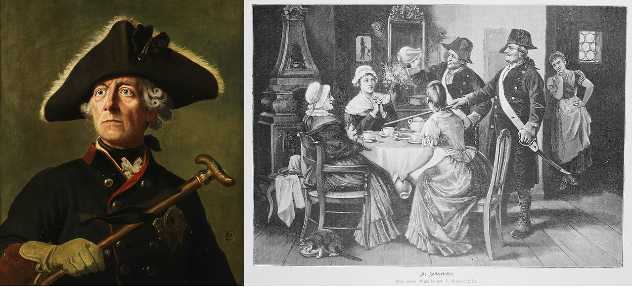 1763년 프리드리히 대왕이 7년간의 전쟁을 끝내고 돌아와 폐허가 된 고국을 재건했다. 재건을 위해 제정적인 문제를 확고히해야 했던 그에게 거슬리는 것이 하나 있었다. 그것은 바로 커피. 커피에 대한 수입에 거액이 쓰이고 있었고 그와 동시에 맥주 산업이 쇠퇴하고 있었기 때문에 왕은 몹시 심기가 불편했다. 왕은 여러가지 법률적 제제 아이디어를 냈지만 소용이 없었다. 특히 국가가 커피를 수입하고 왕이 설립한 커피 공장에서 볶은 원두만 사용하도록 했다. 7년 전쟁에서 부상을 당하고 돌아와 경제적 활동이 어려운 상이 군인에게 ‘커피냄새를 맡는’ (Die Kaffeeriecher)역할을 하여 단속을 맡겼다. 세금도 걷고 전쟁에 출전한 상이 군인의 복지도 해결하는 그야 말로 일석이조의 제도인 셈이다.