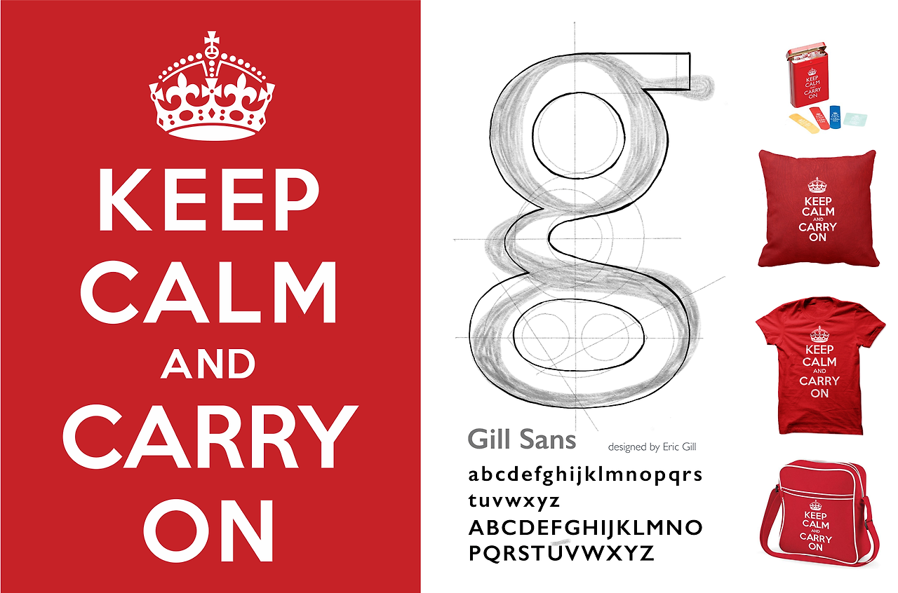 (좌)’KEEP CALM AND CARRY ON’ 포스터 (중) 길 산스 서체 디자인 아이디어 (우) 포스터 디자인 이용 제품들