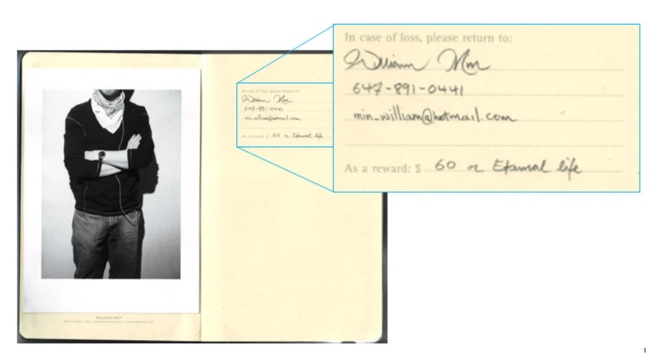시작되는 면지에는 잃어버린 몰스킨을 찾아주는 사람에게 자신의 책을 찾아주면 보상하겠다는 내용을 적을 수 있도록 했습니다. 기록에 가치를 스스로 매겨 쓰도록 만들어 놓은 것이죠.