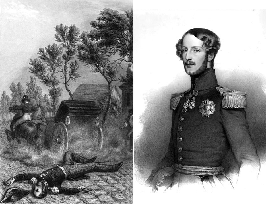 루이 필리프 왕의 장남 오를레앙 공작(Ferdinand Philippe, Duke of Orleans)이 자신의 군을 정비하기 위해 떠나는 날이었습니다. 가족들과 인사하며 마차에 올라앉는 순간 갑자기 말이 미친 듯이 날뛰는 순간 공작은 균형을 잃고 마차 밖으로 튕겨져 땅바닥으로 내동댕이 쳐졌습니다. 그리고, 두개골이 골절되어 의사들이 응급처치를 했음에도 숨을 거두고 말았던 겁니다.