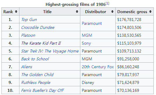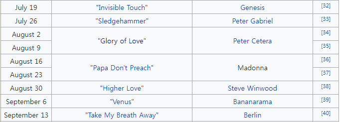 (1986년도 빌보드 1위 차트. 전설적인 뮤지션들이 가득하다)