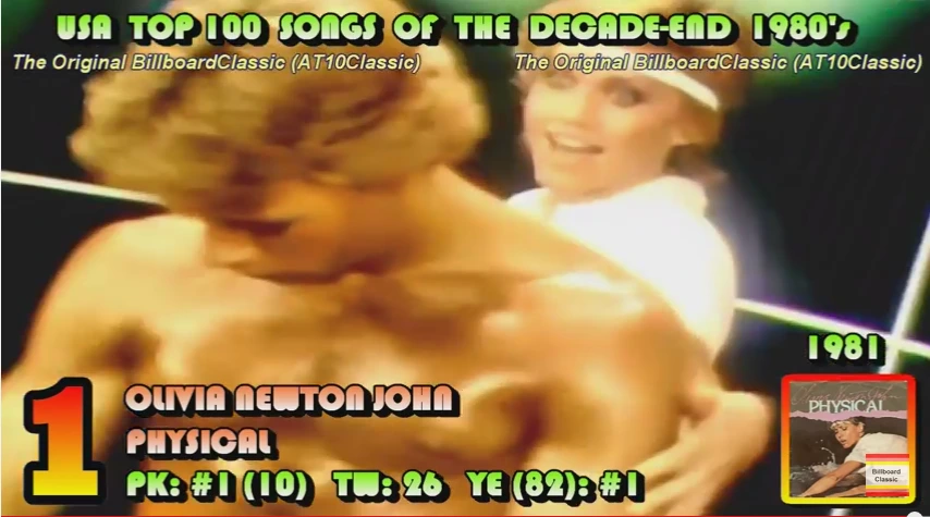 올리비아 뉴튼 존의 대표곡이기도 한 Physical은 1980년대를 전체적으로 통틀어, Decade End로 따졌을 때도 1위를 한 곡이다. (2위는 공교롭게도 킴 칸스의 Bette Davis Eyes)