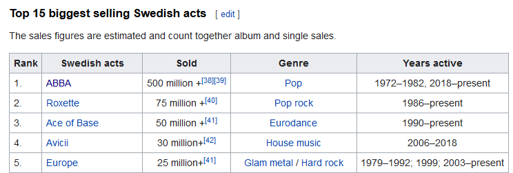어느 시기의 자료를 사용하느냐에 따라 달라지는 부분이 있겠지만 ABBA는 5억장 이상의 판매고를 기록, 압도적인 1위이고, 2위는 록셋(Roxette)으로 7500만장, 3위는 에이스 오브 베이스(Ace of Base)로 5000만장, 4위는 아비치(Avicii)의 3000만장, 5위는 유럽의 2000만장이다.