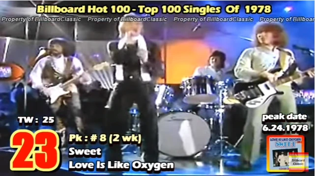 스위트의 노래 중 감성적이고 서정적인 느낌을 주는 곡인 Love Is Like Oxygen. 이 곡 역시 1978년도 히트곡 중 하나로 주간 빌보드 Hot 100 차트 8위, 빌보드 Year-End Chart 23위에 오르게 된다.