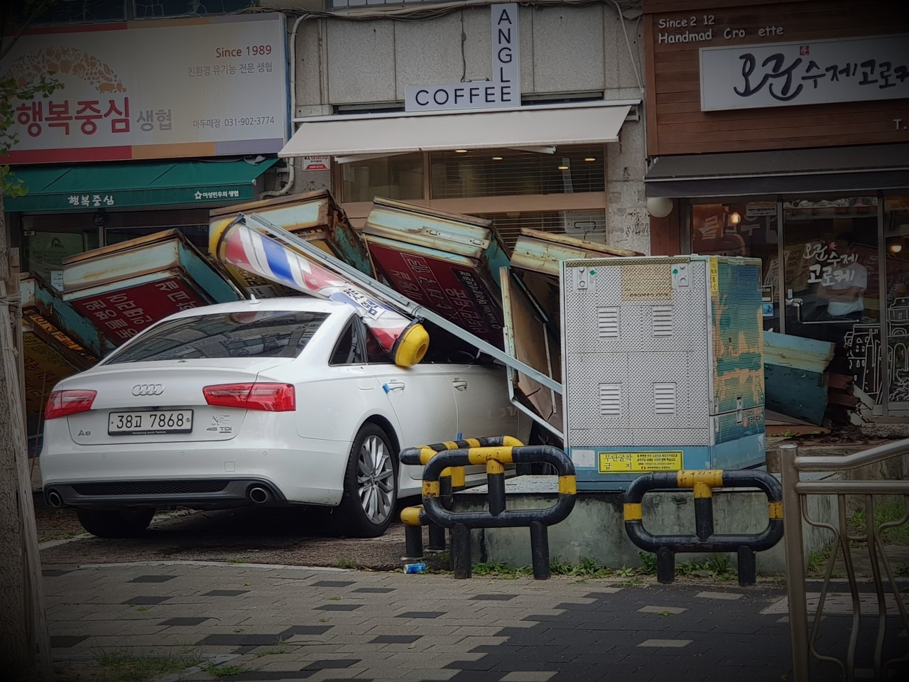 결국 '사람은 땅에 붙어 살아야 안심이 되는 동물인지 모르겠다'란 생각을 하면서 걷는데 건너편 상가에 서있던 지주간판이 넘어져있다. 주차해 있던 차량을 덮쳤는데 다행히 인명피해는 없어보인다. 119차량은 안보이고 넘어진 지주간판을 싣고 갈 차량만 도착했다.