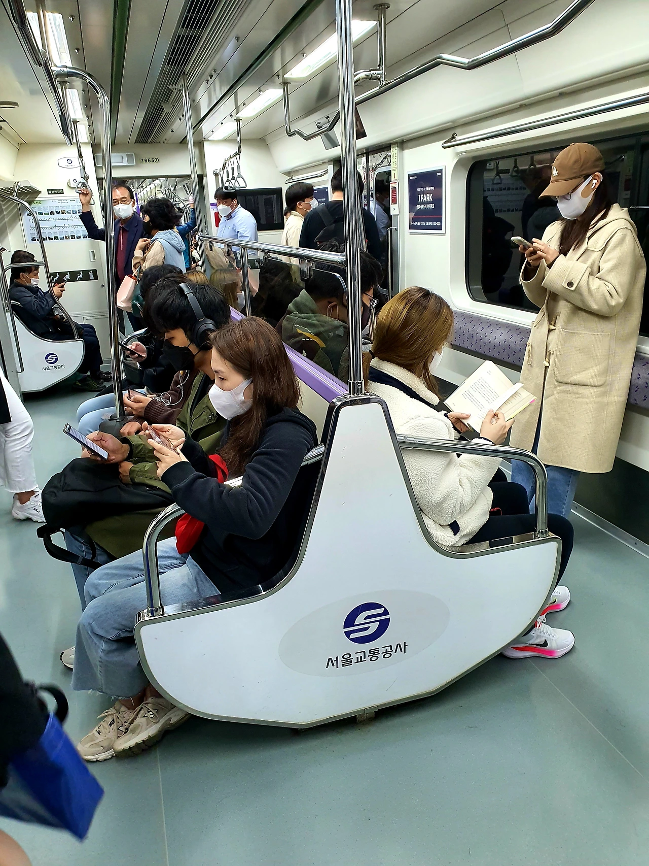 지하철 7호선의 좌석 배치는 창가쪽이 아닌 중앙에 놓여져 등을 맞대고 앉는 구조다. 즉 서서 가는 승객은 창측 벽을 기대게끔 되어있다.