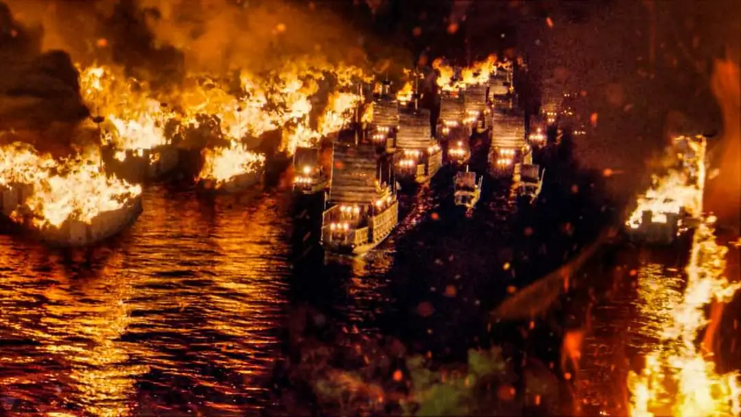 이후 황개는 주유에게 피투성이가 되고 살점이 뜯겨 뼈가 드러나는 곤장 세례를 받고 은밀히 조조 진영에 투항의사를 밝힌다. 이미 주유에게 처절하게 능욕당한 황개의 처지를 알고 있던 조조는 아무런 의심없이 반색하며 그를 받아들이겠다는 전갈을 보낸다. 주유의 계략은 치밀했다. 책사 방통을 조조에게 보내 연환계(連環計)를 쓰게 해서 배들을 쇠사슬에 묶게 한 후 유황과 염초를 가득 실은 황개의 투항선 20척에 불을 붙여 조조의 선단으로 돌진하게 한 것이다. 그리하여 기다리던 동남풍까지 도와주니 주유의 화공은 역사에 남을 엄청난 전공을 기록하게 되는 것이다. 적벽대전의 신화는 실로 오나라의 대들보 주유와 노장 황개가 있어 가능했던 것이다.