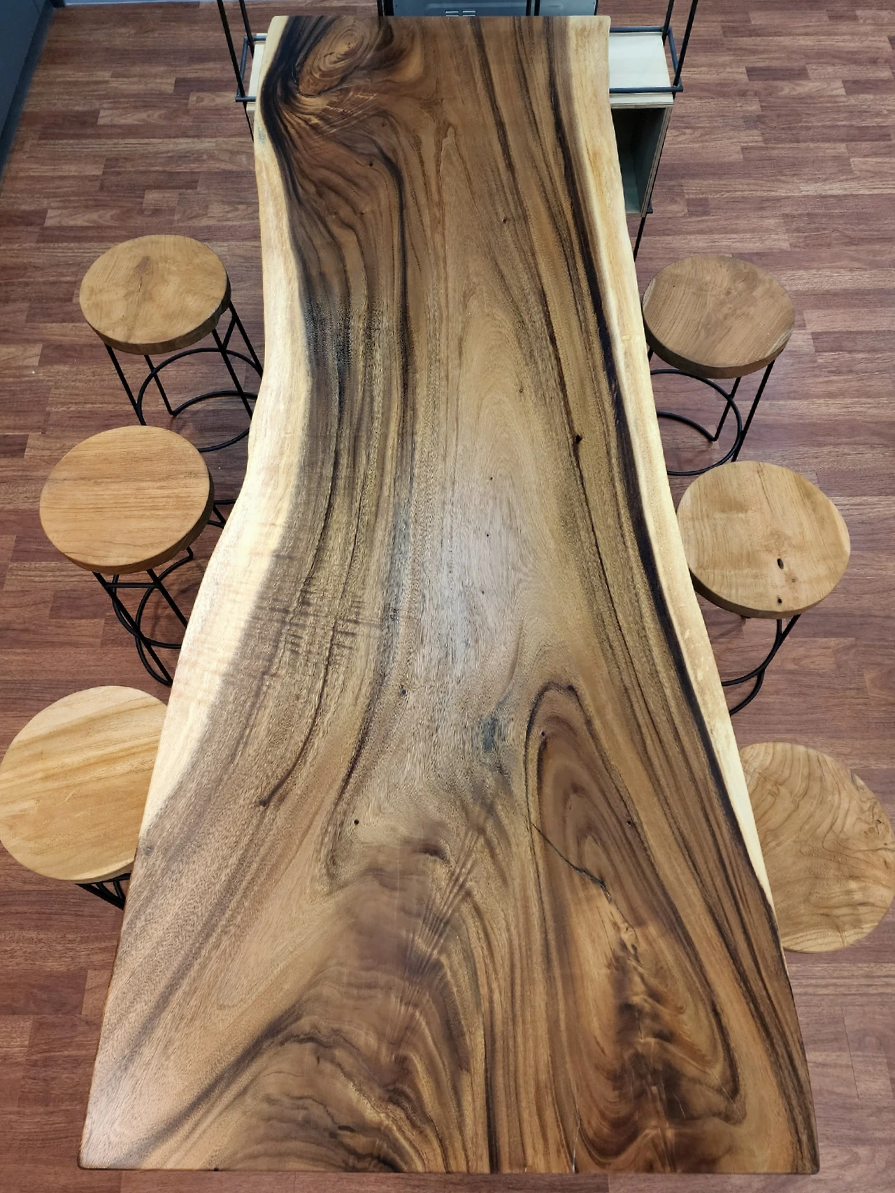 출입문을 들어서면 가장 먼저 이 우드슬랩 바테이블과 마주치게 된다. 현장 작업이 시작되면 매일, 공정마다 사진으로 기록을 남기는데 완공 후에는 여러 위치, 다양한 각도에서 애초의 머릿속 그림과 맞춰 보는 버릇이 있다.