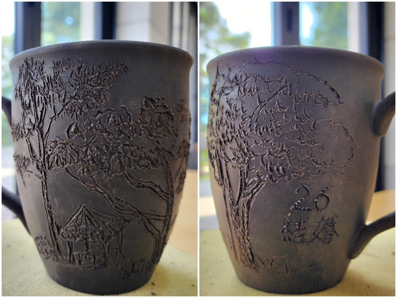 간단한 동물그림, 캐릭터, 문양등 도안을 줬는데 창작욕구가 불타올라 창밖 정경을 컵에 빙 둘러 새겼다.
