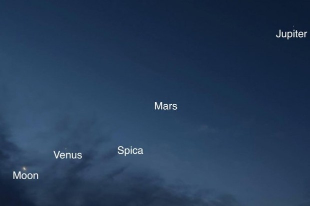 달과 화성, 금성, 목성이 한 장의 사진 속에 담겨있는데, 게다가 직선으로 나란히 일렬로 있는 매우 드문 사진이 화제가 되고 있다.