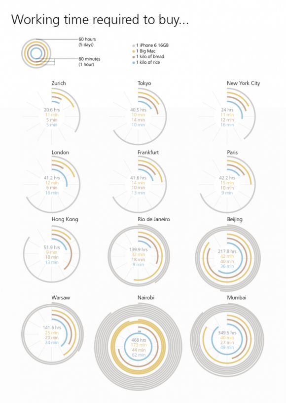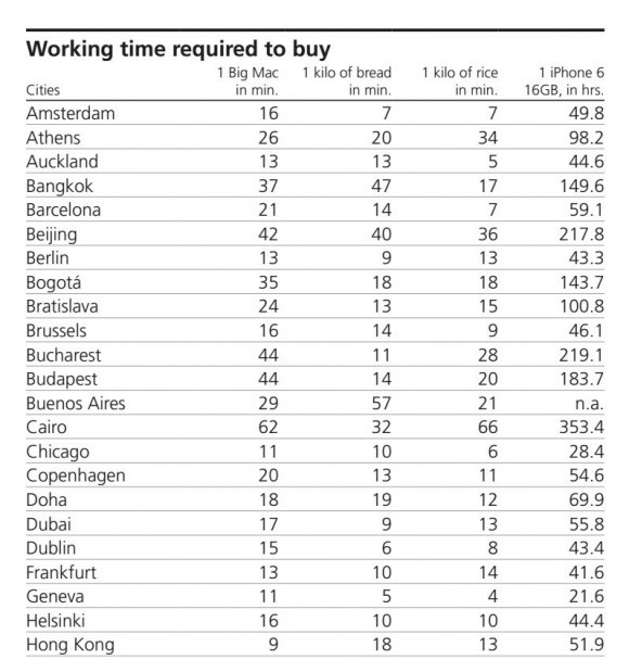 UBS가 최근 발표 한 "가격과 소득 조사 2015년도 판(Prices and Earnings 2015)"에서는 세계 각국의 주요 도시에서 빅맥 1개, 빵 1kg, 쌀 1kg, 그리고 iPhone 6의 16GB를 입수하기 위해 얼마나 일을 해야하는가?가 게재.