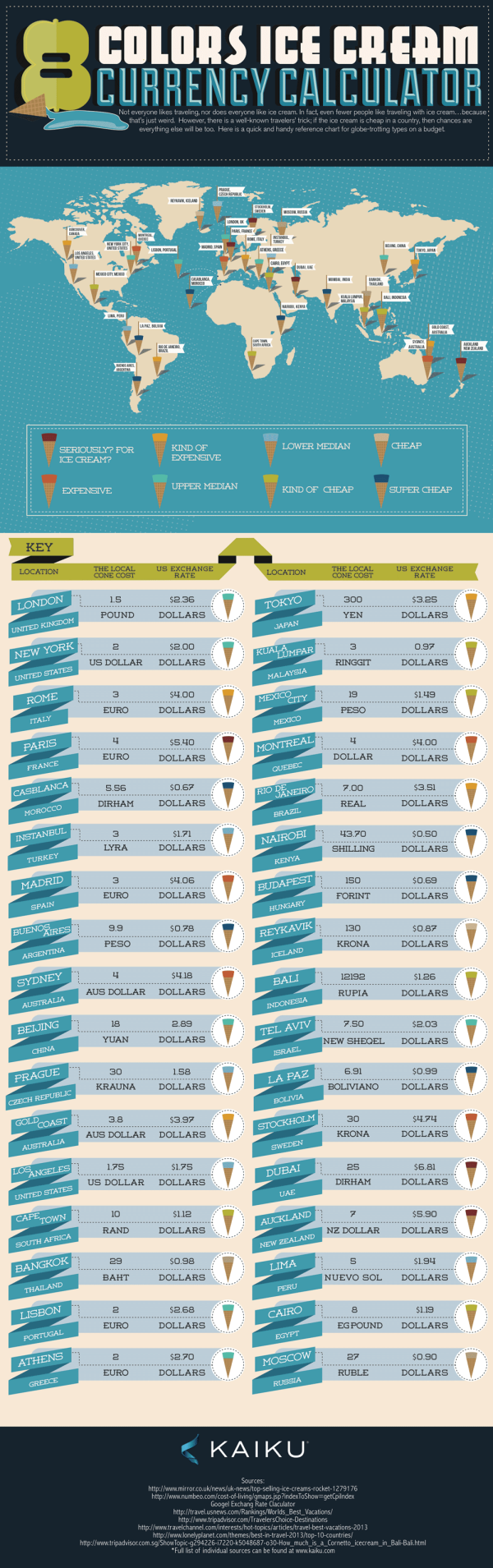 이런 궁금증이 있다는 것을 알고 미국 kaiku가 세계 아이스크림 가격을 알 수 있는 "Ice Cream Cone Currency Calculator"라는 정보 그래픽을 발표했다. 아이스크림의 가격으로 각국의 물가가 어느정도 비교되어 지고 있다.