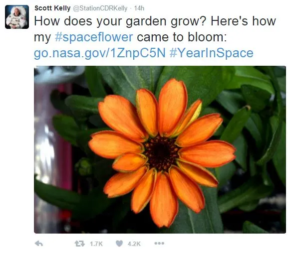 우주에서 처음 핀 꽃의 사진이 국제 우주 정거장(ISS)의 승무원 인 스콧 켈리 우주 비행사에 의해 공개되었다.