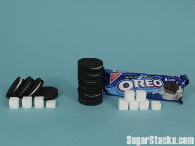 오레오의 경우 6개 들이로 설탕 23g, 총 열량 : 270kcal.