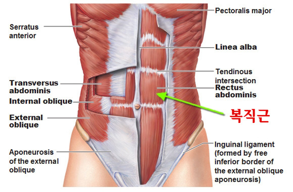 복직근은 갈비뼈 아래에서 치골까지 연결되어 있는 좌우 2개의 납작하고 긴 근육이다. 복근을 나누어 표현하면, 가로의 근육은 복직근을 구분하는 힘줄. 짧은 범위에서 수축시킬 수 있으므로 상단이나 하단만을 강하게 작동하고, 그들을 함께 힘을 발휘하는 컨트롤이 가능하게 되는 것이다.