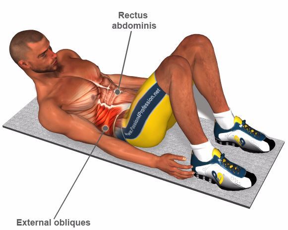 크런치는, 누워서 무릎을 가볍게 굽히고 상체를 일으키는 훈련이다. 의자에 다리를 올려 다리와 무릎을 90도로 구부린 상태로 하는 방법도 있다. 여기서 사용하는 근육은 복직근의 상단.