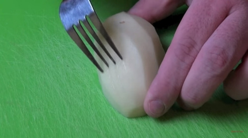 껍질을 깐 감자 표면 전체에 골고루 포크로 긁어주는 것이다. 이때 포크를 깊이 꽂아 큰 구멍을 낼 필요는 없다. 표면만 살짝 살짝 긁어주기만 할 뿐....