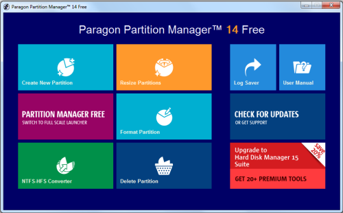"Paragon Partition Manager Free Edition"은 파티션을 생성 및 관리 기능을 제공하는 가벼운 도구이다. 초보자를 위해 설계되어 있는 느낌. 파티션 생성 및 크기 조정, 삭제 등의 옵션을 실행하기 위한 다채로운 타일군으로 준비되어 있다. 하나의 타일을 선택하면, 마법사가 시작, 시작 작업을 단계별로 안내해준다. 이 마법사는 대체로 자동화되어 선택한 작업을 제어하는 옵션은 거의 포함되어 있지 않다.
