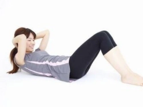여기에서 손을 배꼽 주변에서 떼고, 손을 무릎에 올려놓도록 상체를 약간 들어올린다. 그대로 5초간 유지한다. 허리를 바닥에서 떼지않도록 하면서 턱을 당겨 견갑골이 뜨는 정도로 Ok. 이것을 5~10회정도 반복한다.