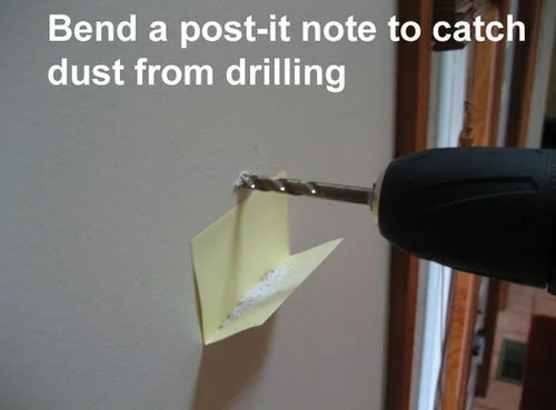 벽에 드릴로 구멍을 뚫을 때, L자로 접은 메모지를 붙이는 것만으로 쓰레기가 흩어지지 않는다.