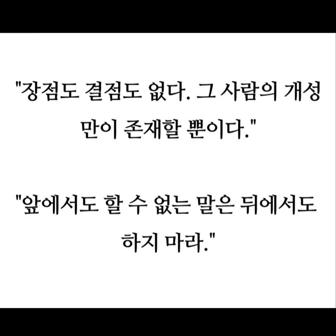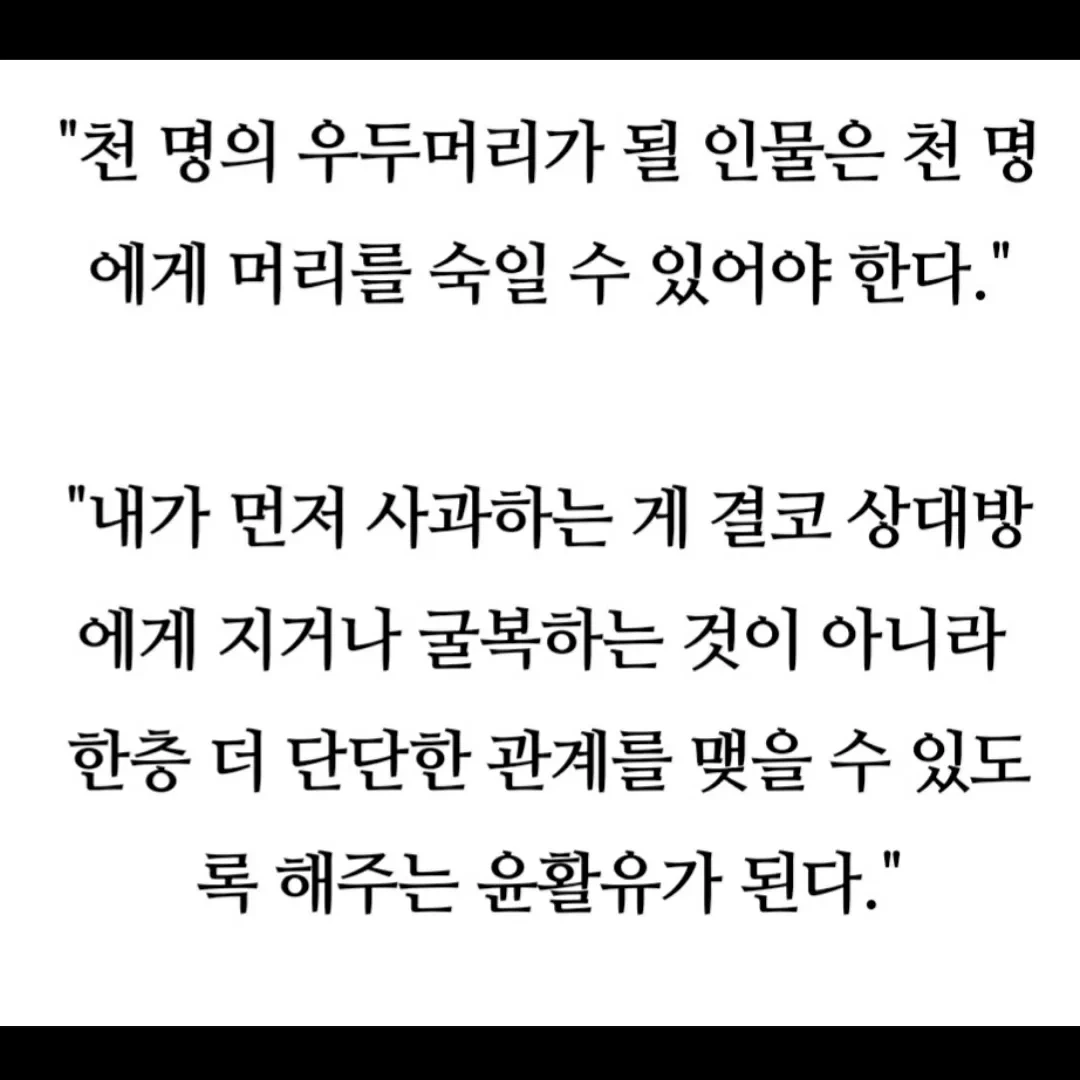 물이 너무 맑으면 이끼도 끼지 않는다고 했던가? 물론 여기서는 이끼가 좋은 의미이다. 사람은 누구나 부족하고 실수를 한다. 다만 실수를 했을 때 어떤 모습을 보이는가가 중요하다. 나의 실수를 깨끗이 인정하고 사과한다면 타인들은 솔직한 모습에 끌리게 되고 누구나 할 것 없이 서로 부족한 부분을 매워주려고 달려들 것이다. 그러면서 돈독하고 끈끈한 인간관계가 맺어지는 것이다.