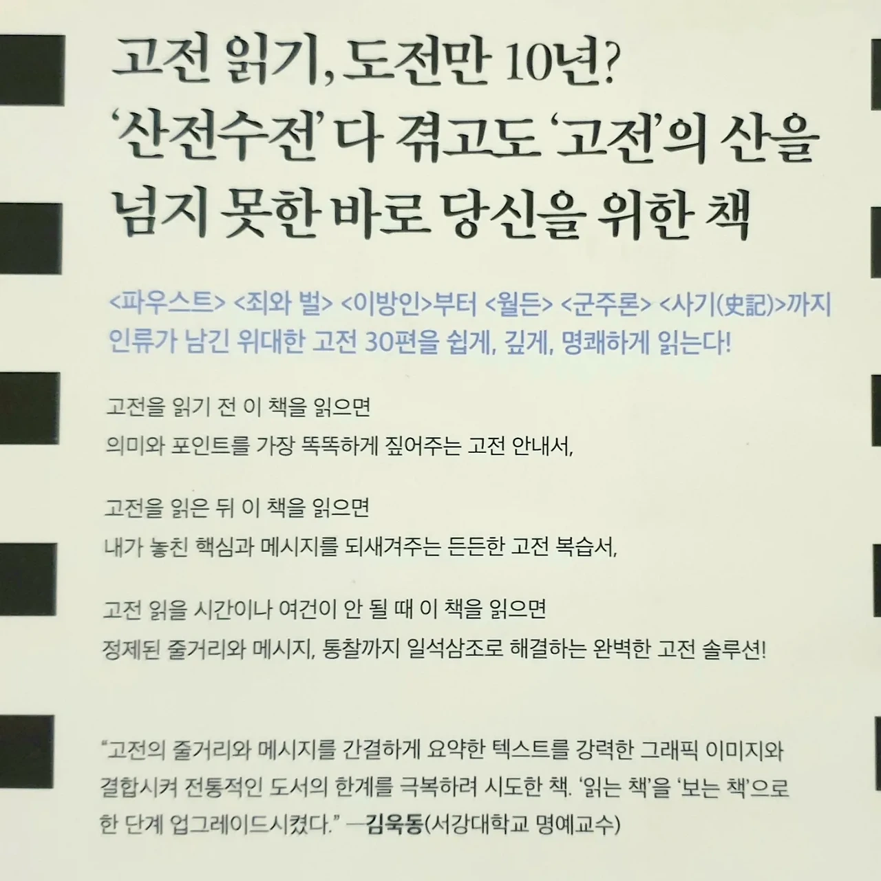 다만, 원작을 전혀 모른 상황에서 읽는다면 다소 이해가 어려울 수도 있다. 워낙 짧게 요약했기 때문이다. 그래도 고전 30편을 언제든 내 것으로 만들 수 있다는 뿌듯함에 늘 곁에 두고 싶은 책이다. 나는 이 책을 이전 직장에 근무할 때 대표이사님으로부터 선물 받았다. "업무로 바쁘기만 한데 웬 고전?" 하며, 한동안 책장 한편에 꽂아두기만 했다.