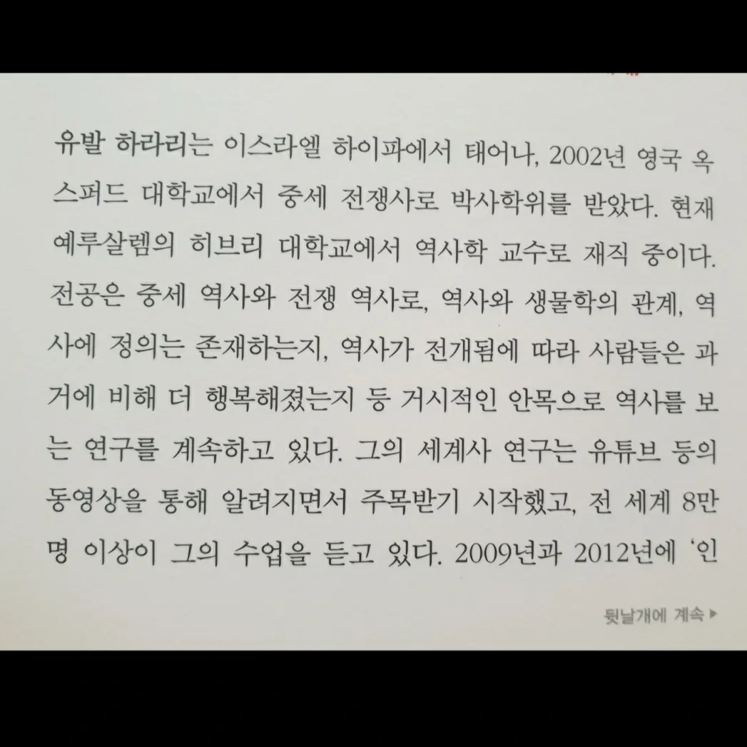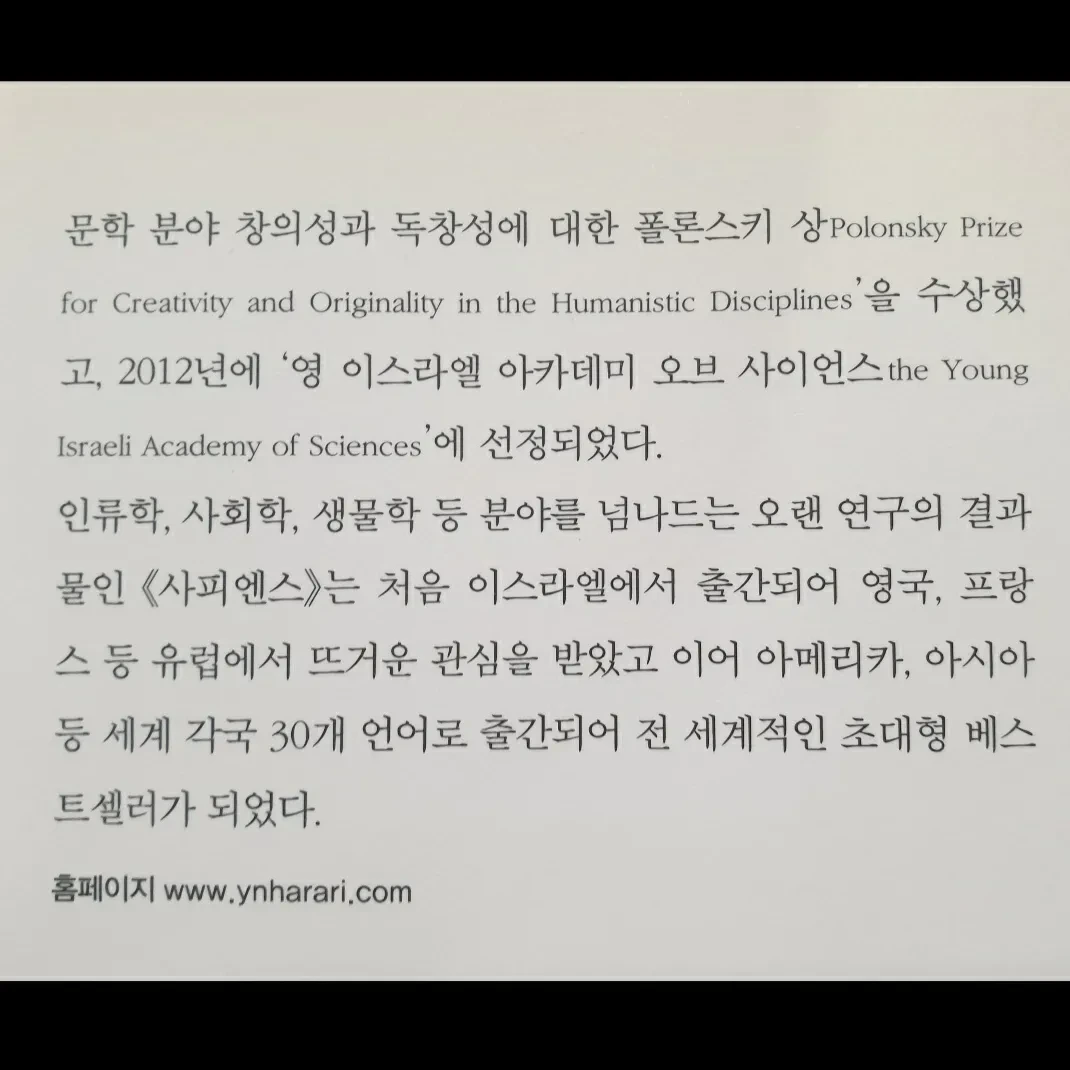 '총균쇠'가 과학자가 쓴 역사서라면, '사피엔스'는 역사학자가 쓴 과학사이다. 유발 하라리 (1976~)는 인간을 사피엔스라고 하는 생물의 일종으로 보는 사회 생물학 개념을 도입하였다. 그는 자연선택의 결과물인 사피엔스가 자연선택의 지배를 벗어나 지적 설계가 통용되는 새로운 역사의 단계로 넘어가려 한다고 주장한다. '사피엔스'의 일부를 인용해 본다.