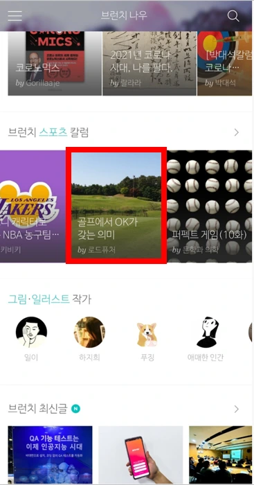 그리고, 브런치 나우의 '스포츠 칼럼'에도 소개되어있었다. 브런치 최신 글을 제외하고 브런치 나우에 소개된 건 이번이 처음이었다.