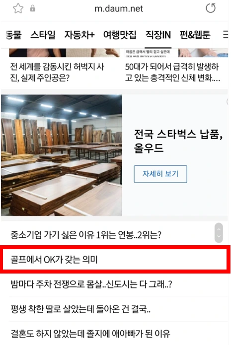 지난번과 마찬가지로 갑자기 조회수가 올라가길래 이번엔 익숙한 마음으로 다음 앱을 열고 찾아보았다. 모든 카테고리를 확인해보니 아래와 같이 '직장IN' 코너에 소개되어있었다. 흥미로운 것은 스포츠란의 골프 코너가 아니었다는 것이다. 지난번 글도 내용과 크게 관련이 없는 '홈&쿠킹' 코너에 실린 걸로 보아 다음 특유의 매칭 알고리즘이 있는 게 아닌가 생각된다. 그런데, 지난번과 달리 이번엔 사진 없이 제목만 노출되어있었다. 그래도 이게 웬일인가? 불과 며칠 만에 다음 메인에 또다시 글이 소개되다니 내 마음은 기쁨을 넘어 충격에 다가가고 있었다.