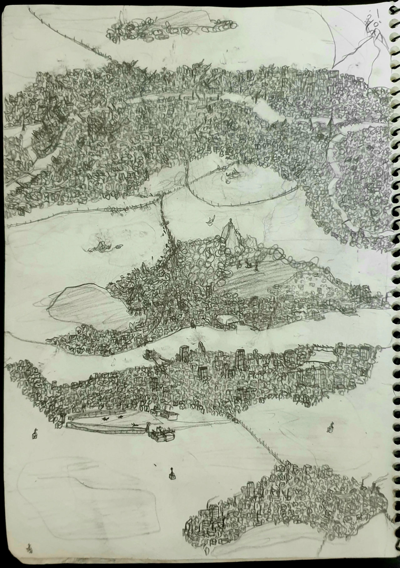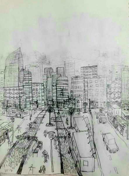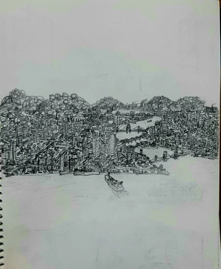 이번 그림도 전경을 묘사하긴 했지만 오로지 떠오르는 생각대로 연필이 가는 대로 그린 것이다. 투시나 원근, 입체감이 완벽과는 거리가 멀다. 오히려 빽빽하게 들어찬 주택가의 세밀함과 여백처럼 한산한 뒷 배경의 극렬한 대비가 그림의 주요 특징으로 보인다. 실물과 같고 다름을 떠나 자신만의 스타일을 그림에 입힌 것이다.