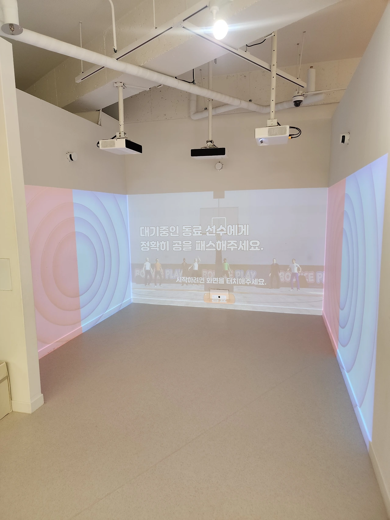 멀티미디어 시설을 통해 가상 화면을 터치하거나 공을 던져보는 야구 게임, 윙크 게임 같은 활동도 할 수 있고, 바닥에 빔을 활용한 인터랙티브 놀이도 가능합니다.