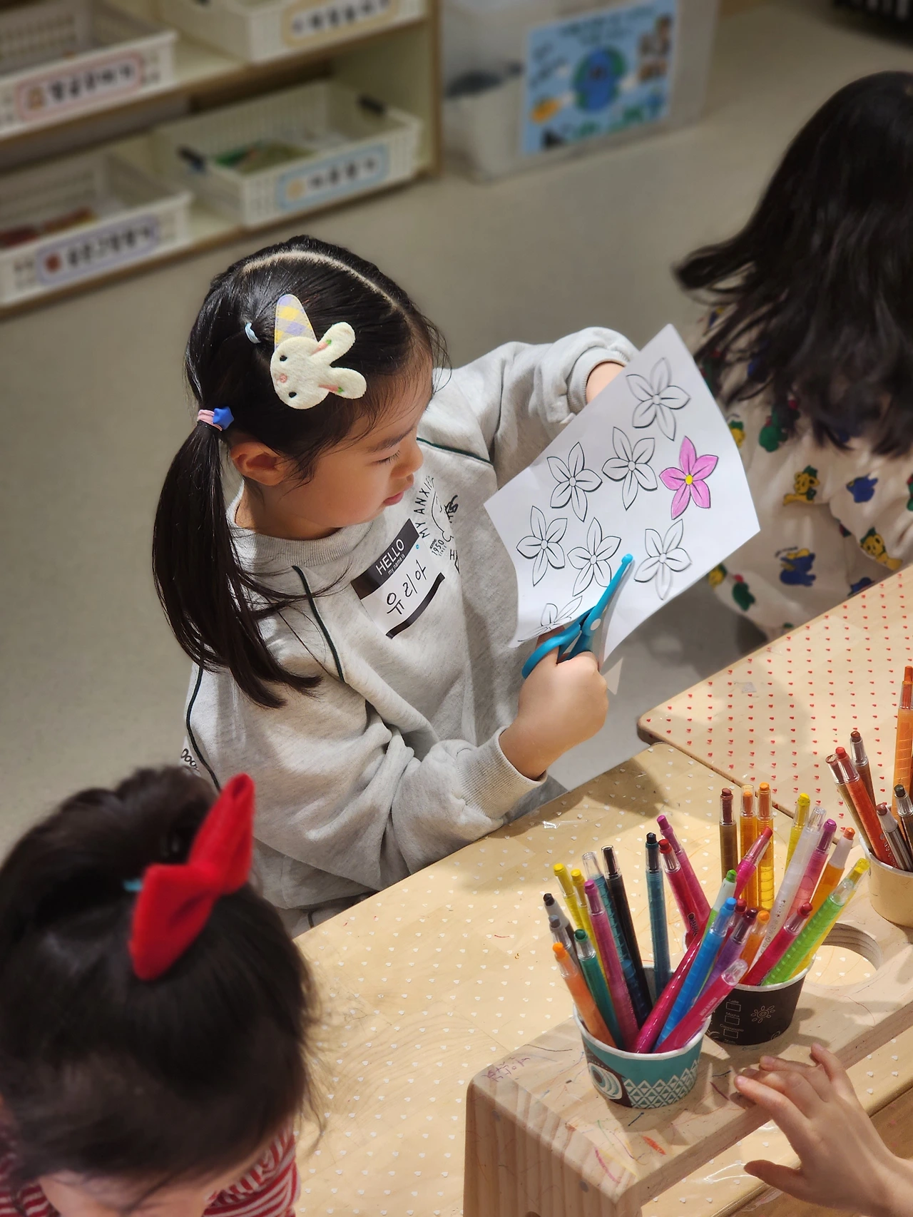 보통 키즈카페에서 색칠놀이라고 하면 정해진 도안을 색칠하고 끝나는 경우가 많은데, 이곳에서는 손그림 잡기, 얼굴 그리기, 입체 활동지 만들기 등 아이가 직접 가위로 자르고, 그리고, 조립하면서 하나의 결과물을 완성할 수 있는 활동들이 제공됩니다.