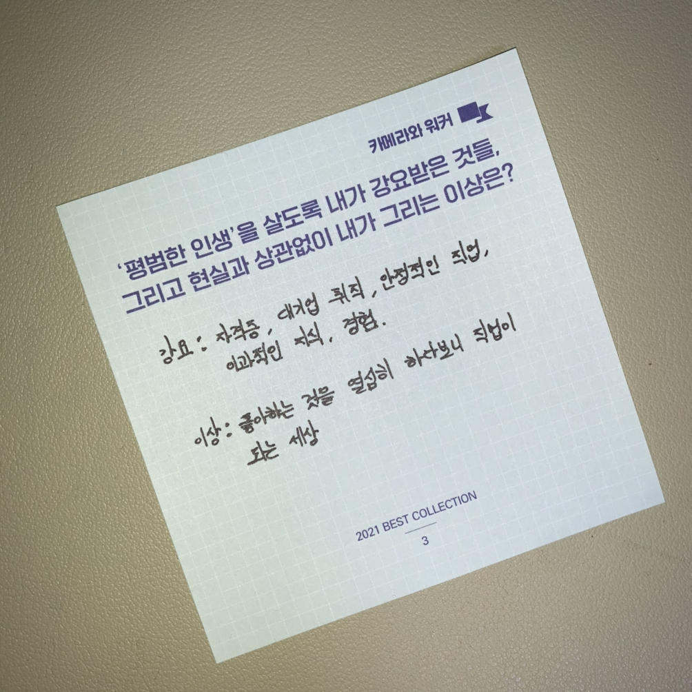 카메라를 들고 가족들과 나들이를 가는 미래는 김훈의 고모나 할머니에게는 유토피아 같았을지도 모른다. 명문대를 나와서 대기업에 취직해서 안정적으로 사는 삶도 우리 부모님께는 어떠한 유토피아였을지도 모르겠다. 사랑하는 아이가 유토피아에서 살기를 바라는 마음이었을지도 모른다. 그러나 세상에는 유토피아란 없고 이상과 꿈은 남이 꿔주는 것이 아니기에, 카메라를 들려주려 하기보다 워커보다 더 어울리는 신발을 신겨주는 것이 먼저이지 않았을까.