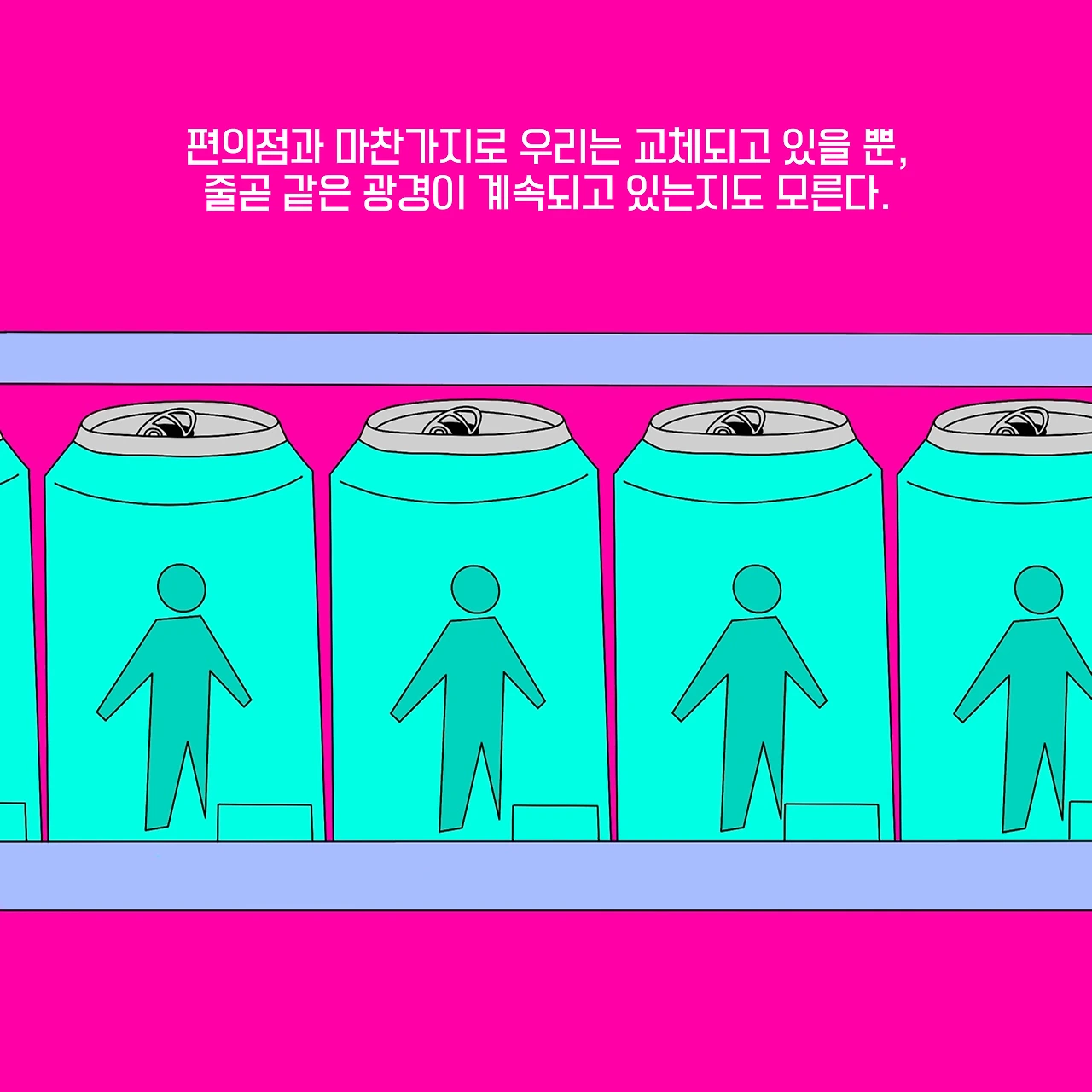 점점 규율에 갇혀가는 것은 누구일까. 편의점에 나열되어 있는 음료수일까, 편의점에서 일정한 하루를 보내는 프리터일까, 어느샌가 사회에 녹아들고 있는 우리일까?