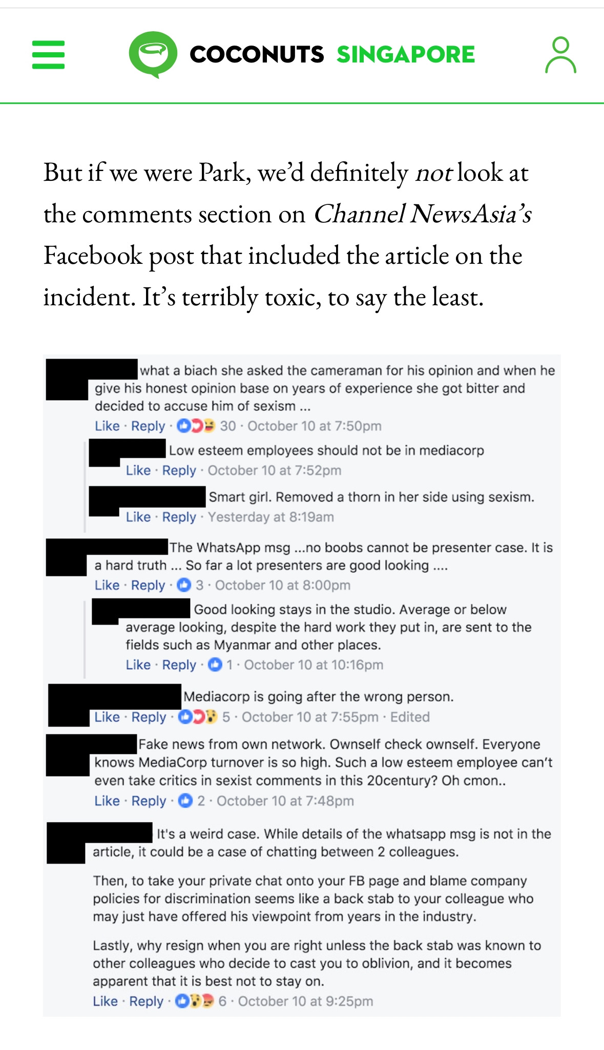 온라인 포럼과 소셜미디어에는 나에 대한 각종 루머와 꽃뱀설이 난무했다. ”너네 나라로 꺼져 ㅆㄴ,“ ”못 생긴 X가 일부러 아나운서 되려고 벌인 일이다 “등 혐오가 가득한 이메일과 페이스북 메시지를 매일 받았다.
